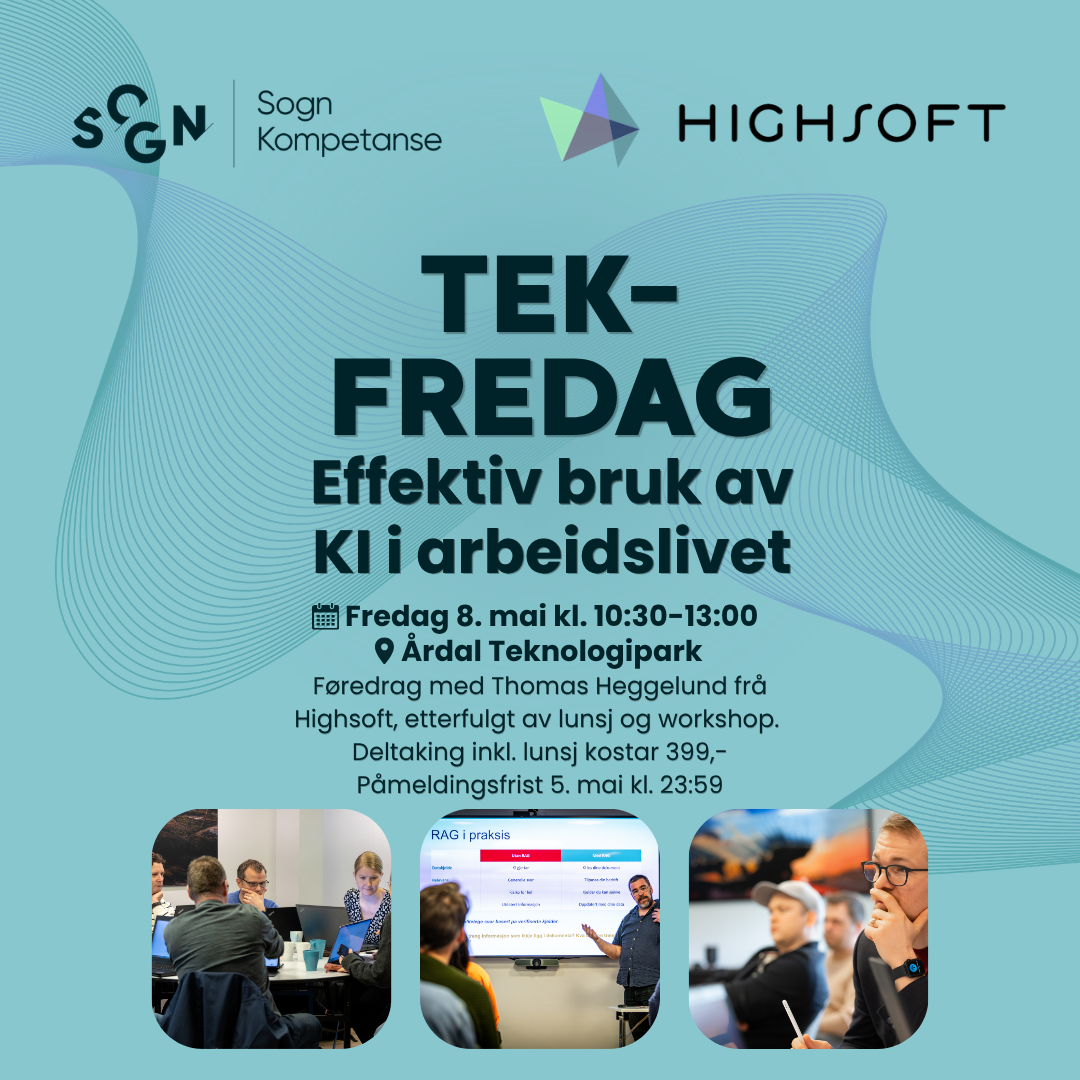 I samarbeid med Highsoft inviterer Sogn Kompetanse til ein inspirerande dag der du får både fagleg påfyll og praktisk erfaring med KI.
